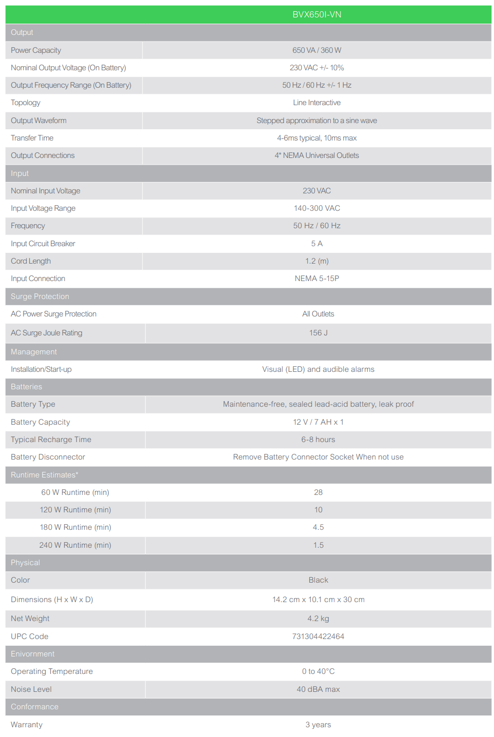 Đây là bộ nguồn dự phòng có công suất nguồn đầu ra là 375 W / 650 VA. Nó kéo dài 2/6/10 phút khi sử dụng 240/180/120 W.