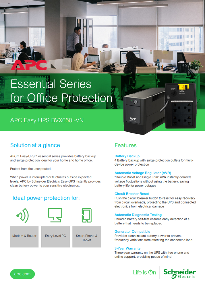 APC easy UPS BVX650I-VN,230V (SFAPC22-002)_QABUPS có công suất 650VA/300W, điện áp đầu ra 230V có tần số 50/60Hz (tự động nhận).