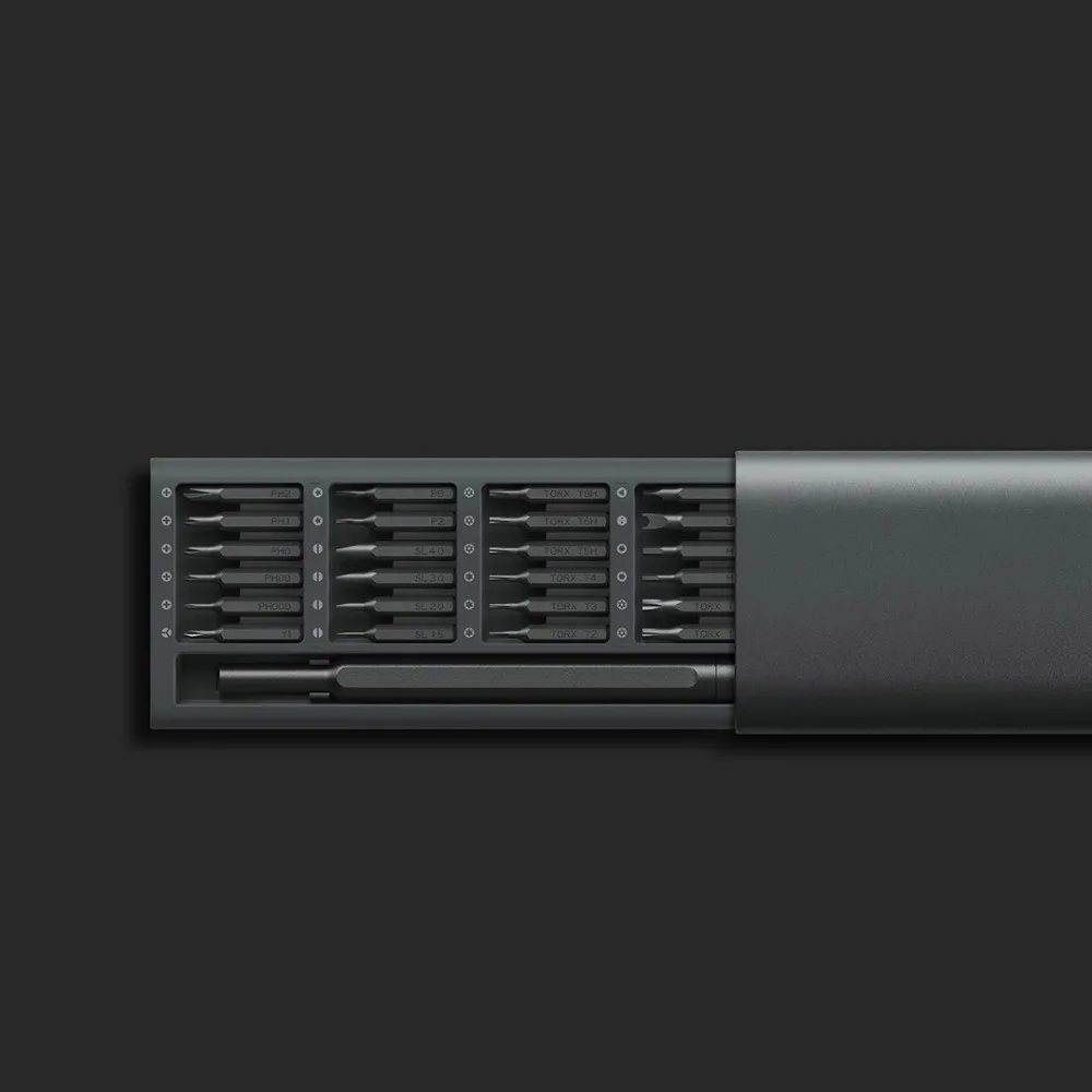 Tua vít được thiết kế dạng oval mỏng, nhỏ gọn, với đầu vít được gia công kỹ lưỡng có độ chính xác cao. Toàn bộ 24 đầu vít được đựng trong hộp chứa hình chữ nhật nhỏ gọn. Tổng trọng lượng bộ sản phẩm chỉ có 300g cùng thiết kế gọn gàng giúp người dùng dễ dàng bỏ túi và mang theo bất cứ đâu.