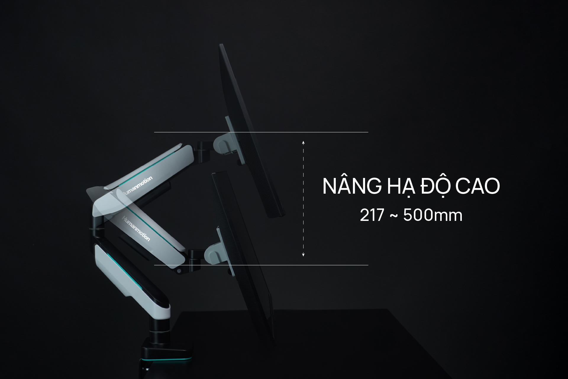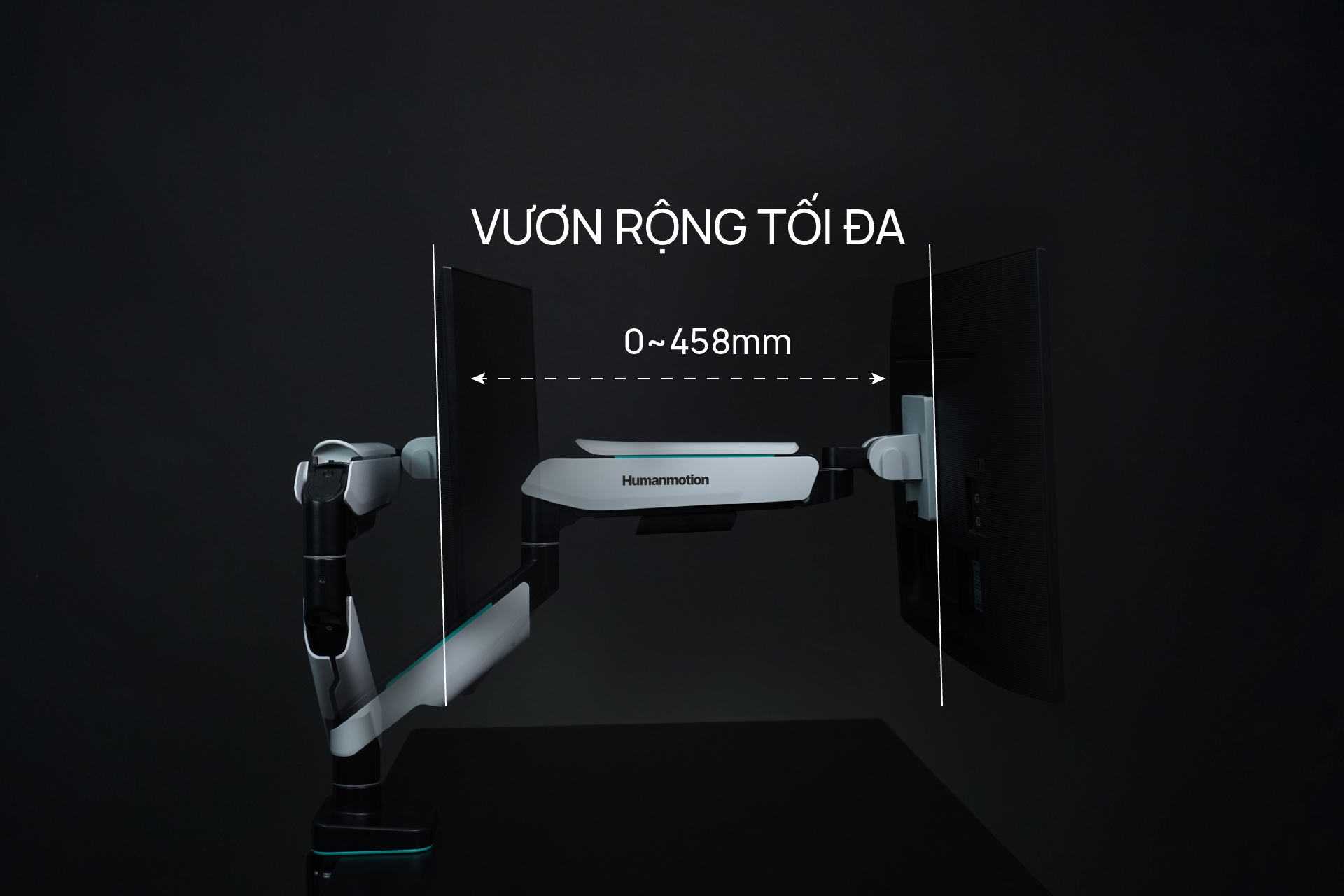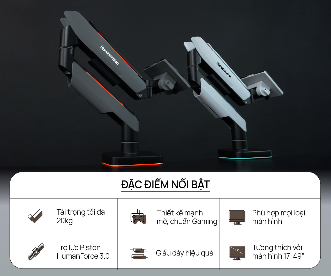 - Human Motion hỗ trợ 2 hình thức là kẹp bàn và khoan lỗ trên mặt bàn. Rất linh hoạt để khách hàng lựa chọn.