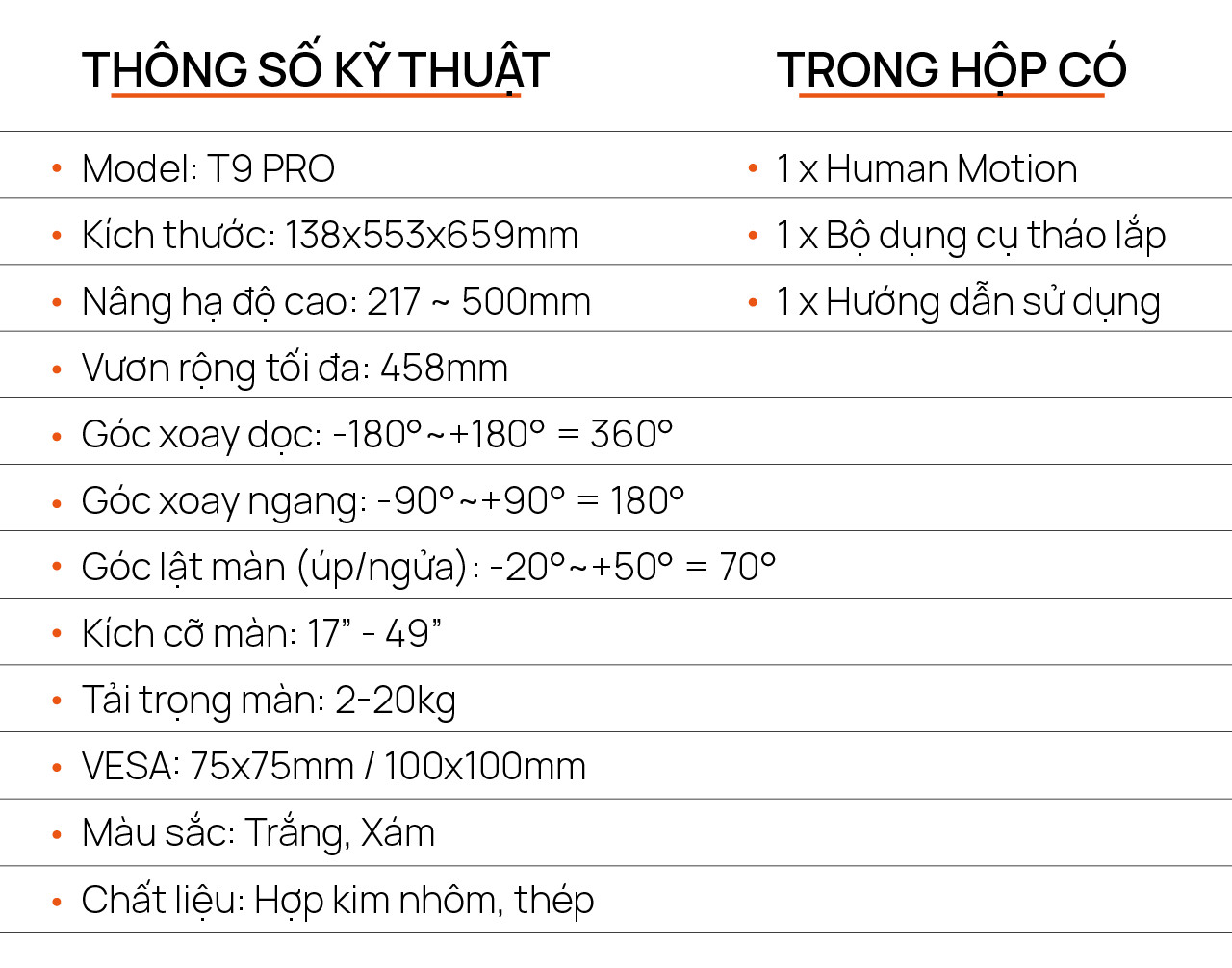 Human Motion T9 Pro là Tay treo màn hình (Hay còn gọi là giá đỡ màn hình, monitor arm,...) có tác dụng thay thế cho chân mặc định của các loại màn hình máy tính giúp người sử dụng có thể xoay, điều chỉnh vị trí màn hình 1 cách tiện lợi. Ngoài ra, tay treo màn hình còn giúp: