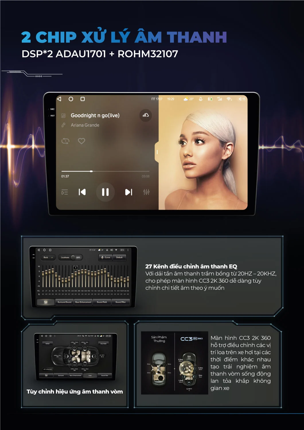 | Âm thanh | 1 x chip ADAU 1701 1 x chip ROHM 32107 27 kênh EQ âm thanh vòm 5.1 |