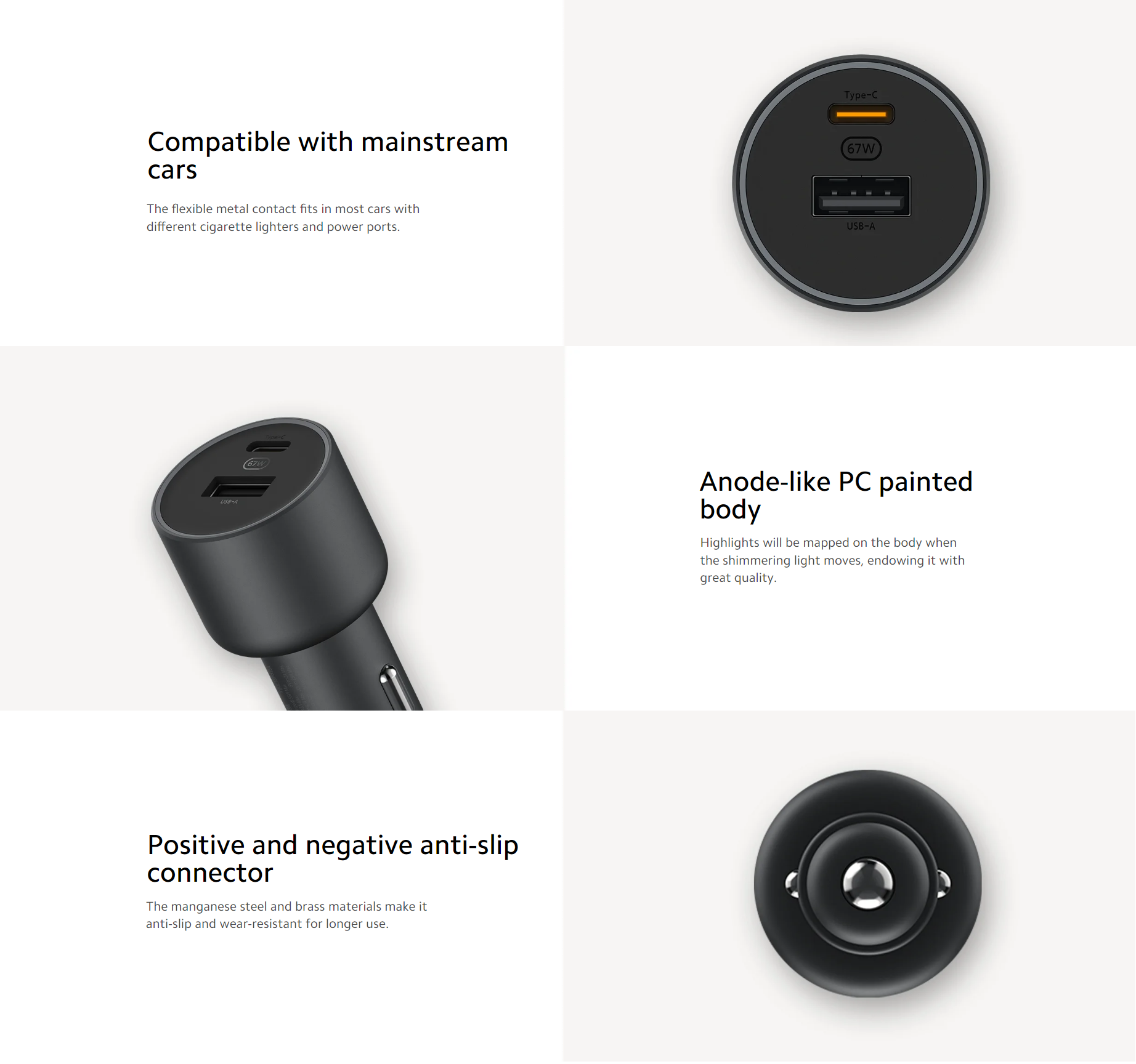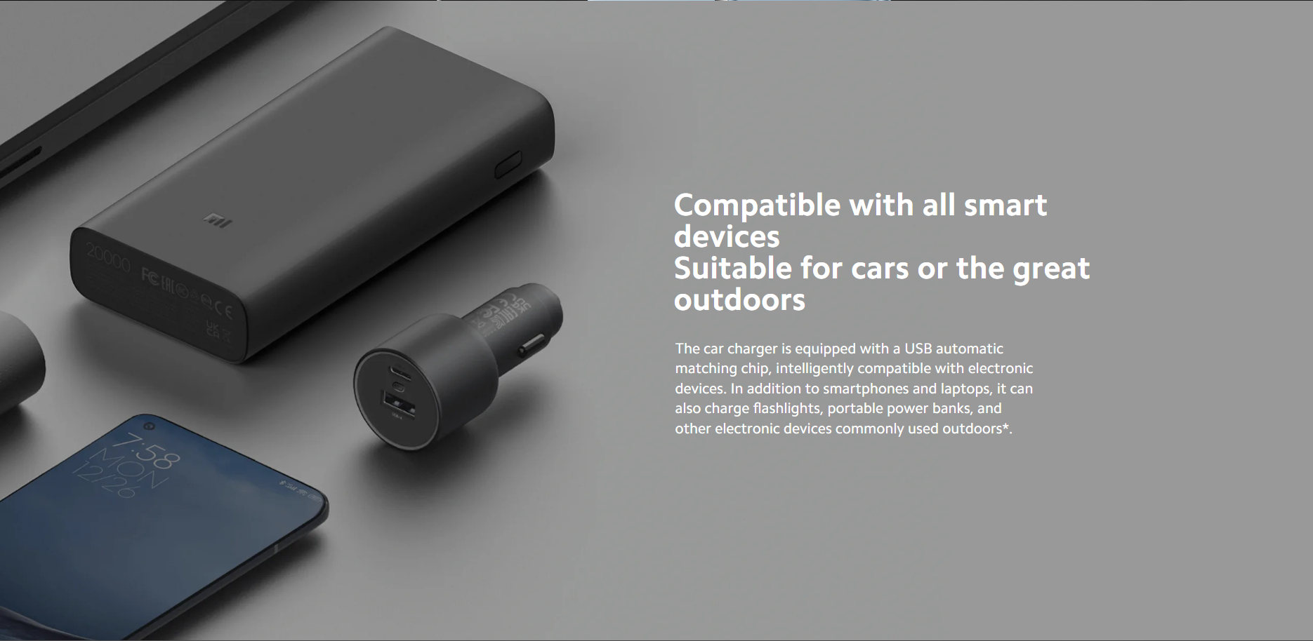 Bộ sạc xe hơi được trang bị chip kết nối tự động USB, tương thích thông minh với các thiết bị điện tử. Ngoài điện thoại thông minh và máy tính xách tay, nó còn có thể sạc đèn pin, sạc dự phòng di động và các thiết bị điện tử khác thường được sử dụng ngoài trời
